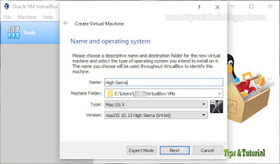 2. Gunakan nama versi macOS anda untuk menamai virtual machine anda. Misalnya, High Sierra atau Mojave. Jenis dan versinya harus diisi otomatis dengan pengaturan yang benar.
